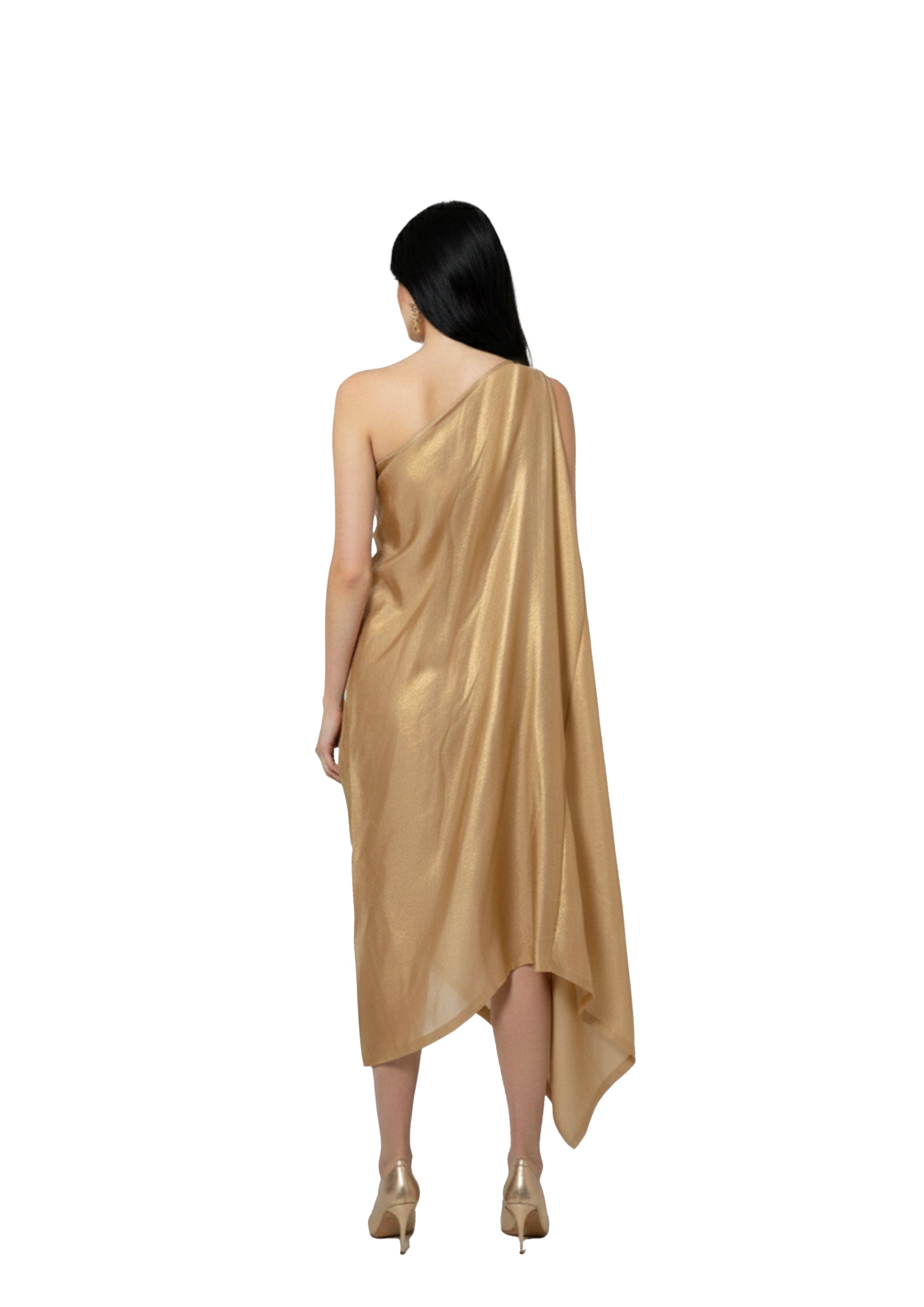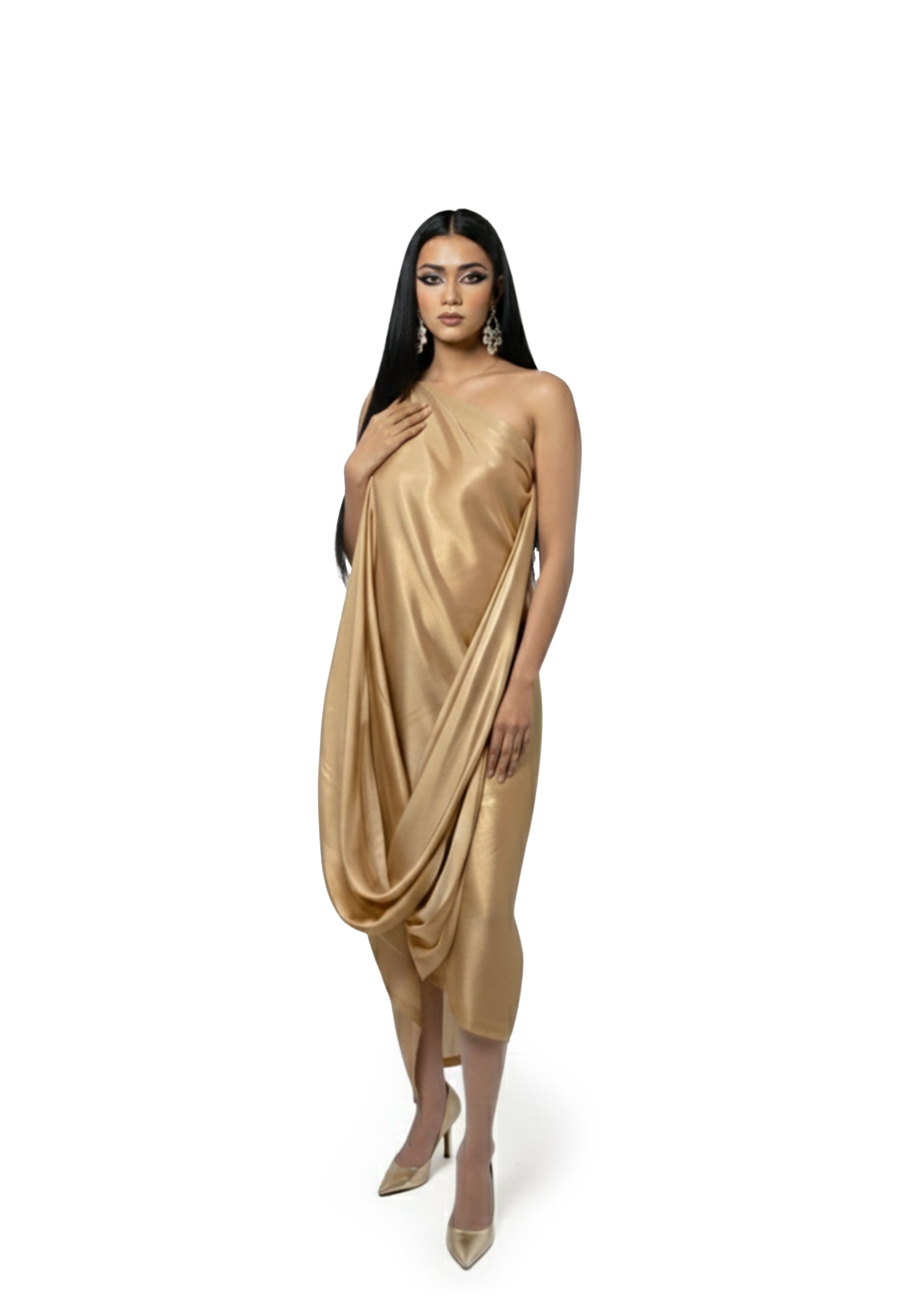 A shimmer georgette dress shaped through a zero-waste draping technique,