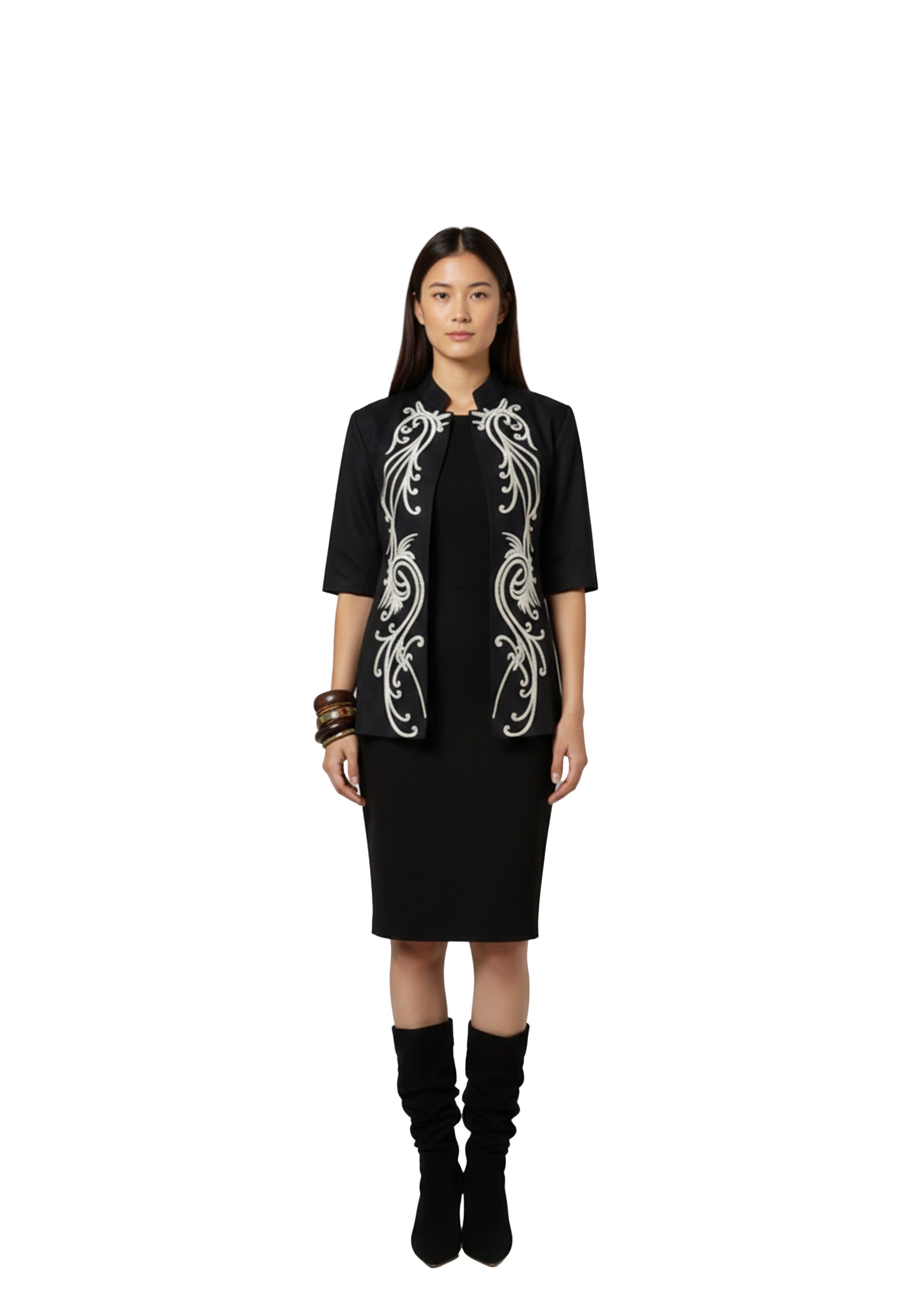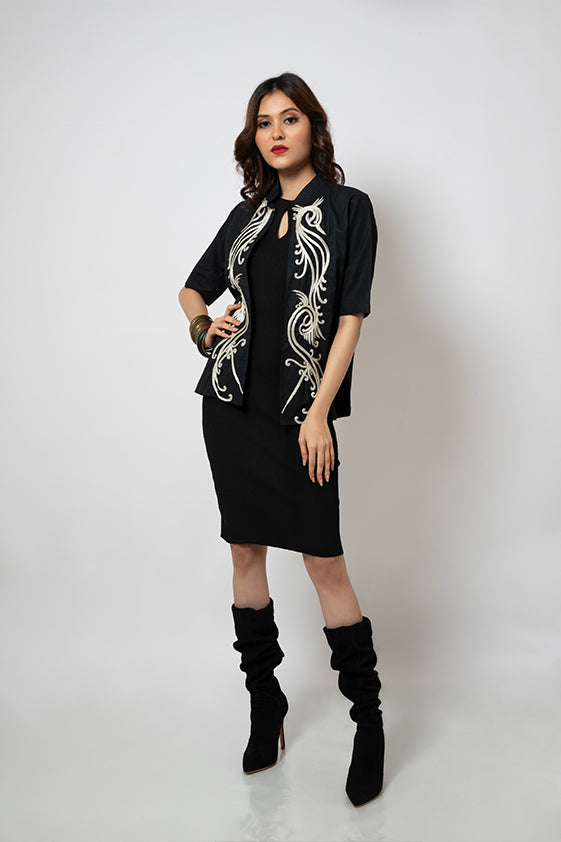 Design: Black jacket with symmetrical resham thread hand embroidery