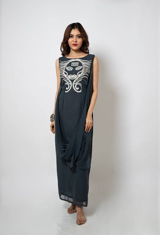 Design: Grey georgette with symmetrical resham thread hand embroidery