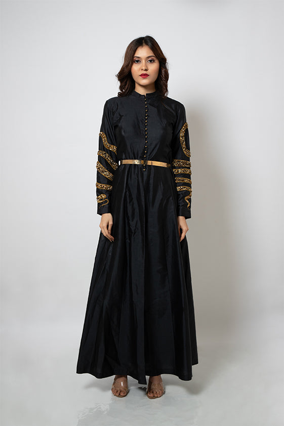 Black Silk Blend Long Jacket Dress with exclusive serpent hand embroidery on sleeves