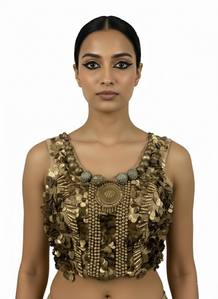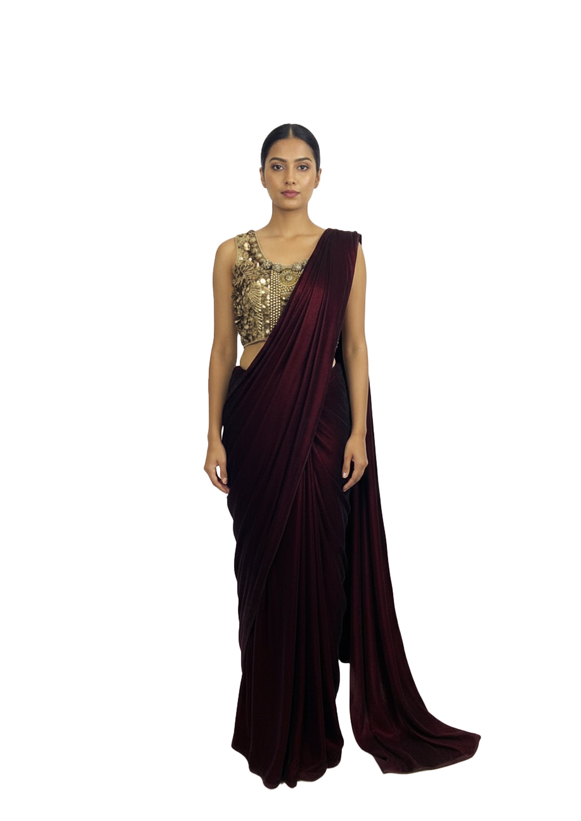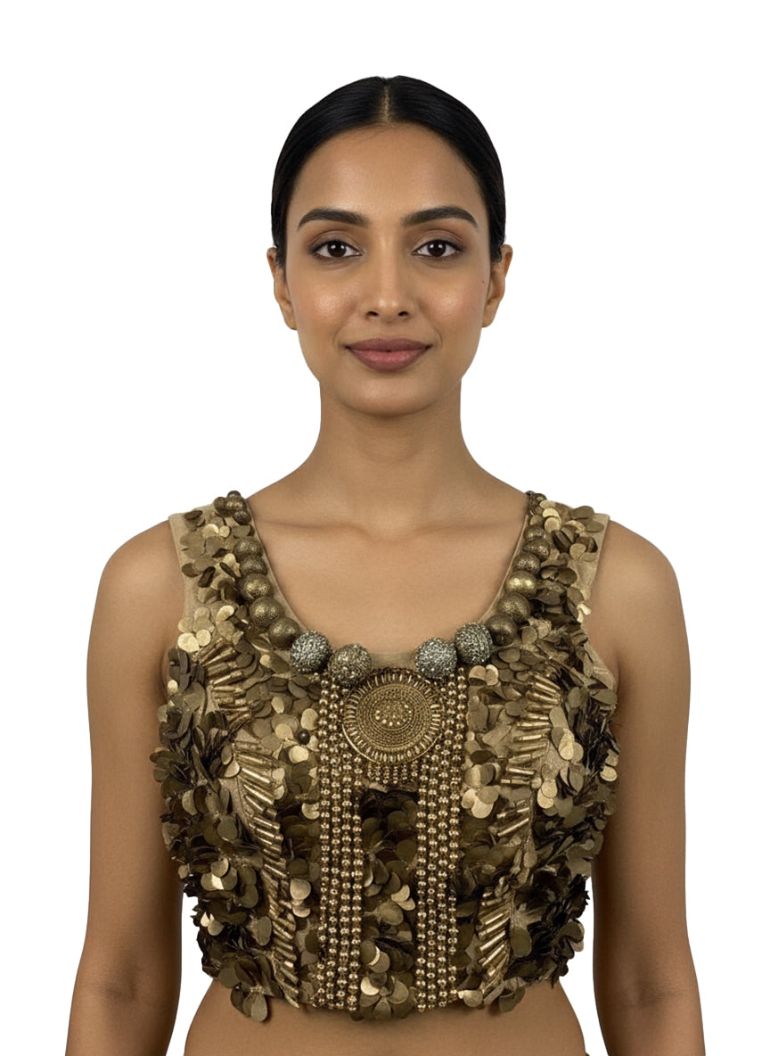 Varanasi is an emotion you feel the moment you arrive - a deep connection to yourself. This design is a visual and tactile expression of that feeling. Hand-embroidered silk is adorned with unique antique beads sourced from Turkman Gate and Chandni Chowk in old Delhi, paired with a velvet net saree.